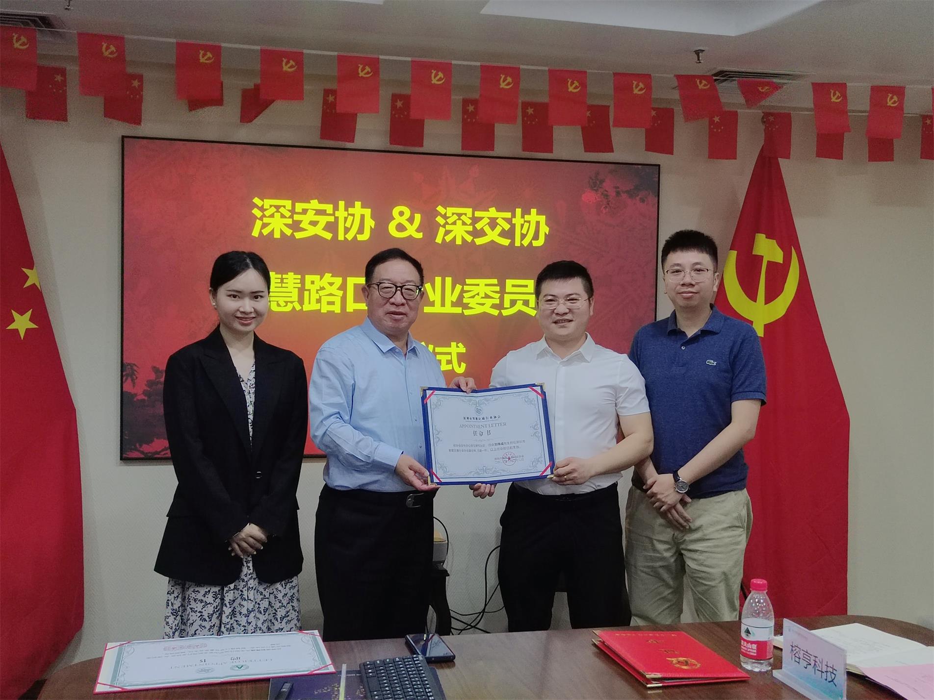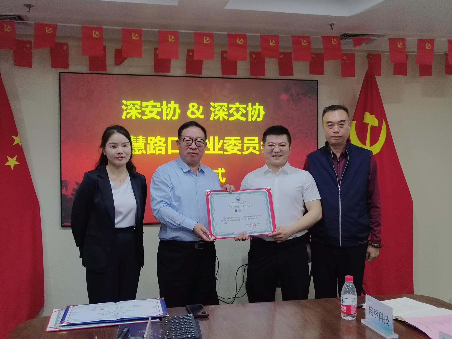 圖為歐洲科學院院士、CPSE 安博會主席,世界無人機大會主席、深圳市安全防范行業協會和深圳市智能交通行業協會創會會長楊金才為宇航工業交換機劉總頒發深交協副會長任命書。深交協副秘書長李霞、副秘書長林馴一起合影留念。