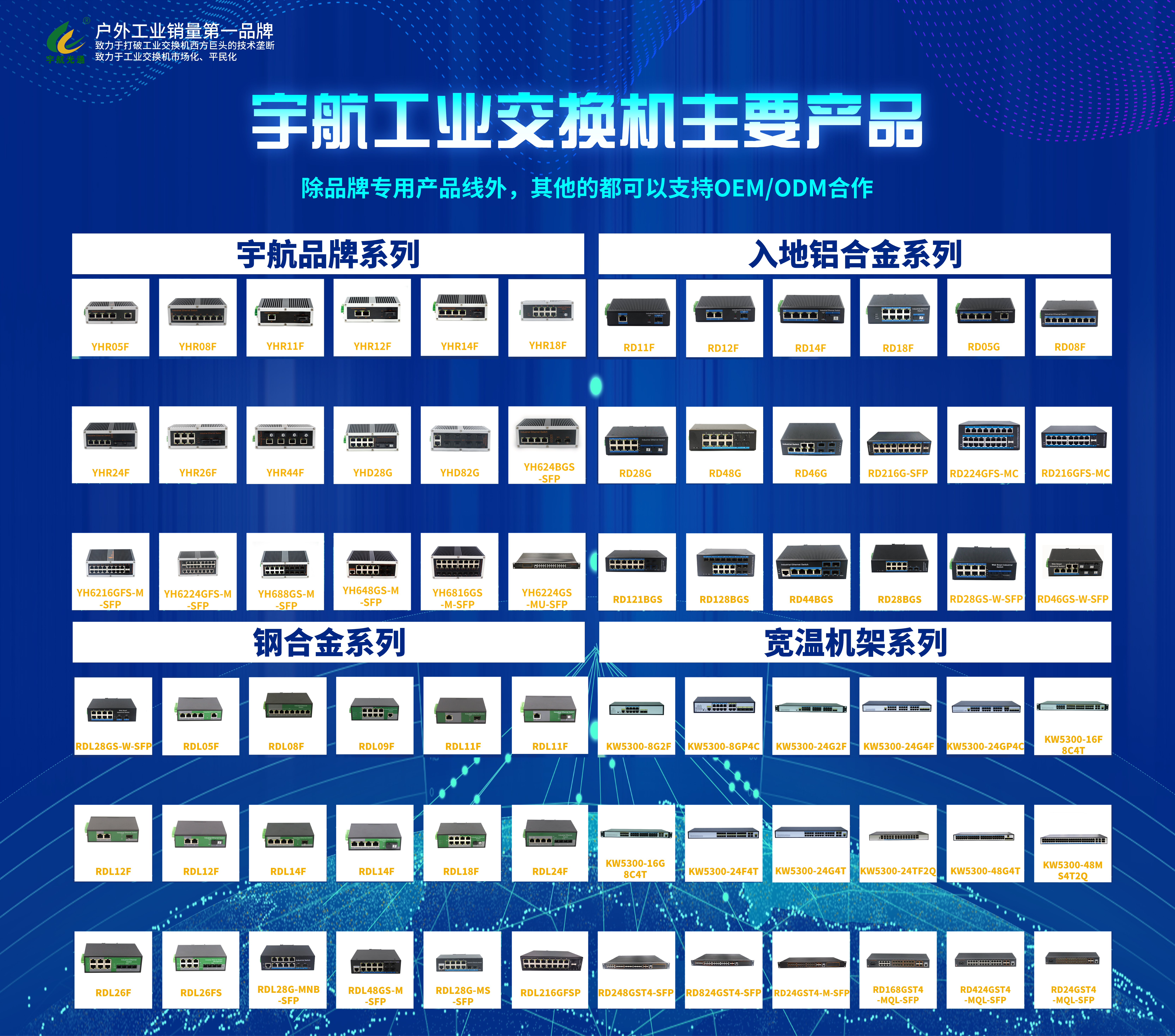 深圳市宇航光通科技有限公司自2012年成立以來,是一家聚焦于工業(yè)交換機的源頭廠商,也是國產(chǎn)工業(yè)交換機最大的源頭廠商,宇航專注于工業(yè)交換機品牌市場和中大型客戶OEM/ODM市場。產(chǎn)品包括工業(yè)級收發(fā)器、工業(yè)級交換機、工業(yè)級POE交換機、二層網(wǎng)管型工業(yè)級交換機、三層網(wǎng)管型工業(yè)級萬兆交換機、機框式插卡工業(yè)交換機、純國產(chǎn)工業(yè)交換機等。多年來,宇航致力于打破工業(yè)交換機西方巨頭的技術(shù)壟斷,致力于工業(yè)交換機市場化、平民化。宇航,戶外工業(yè)交換機銷量第一品牌!