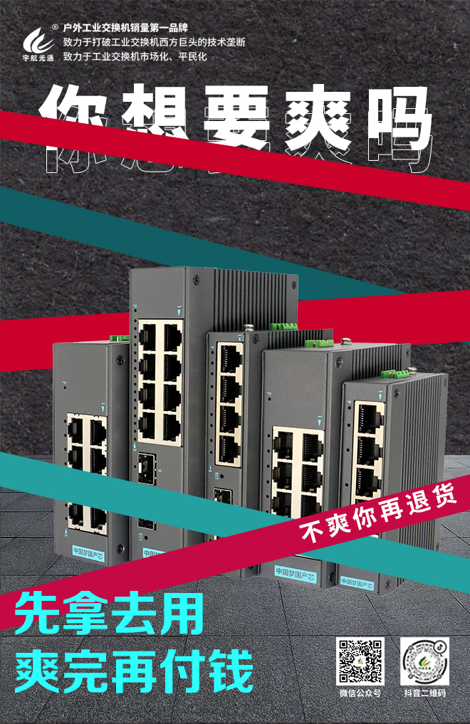 宇航堅定地與國產戰略緊密結合,緊跟國產芯和中國夢的宏偉目標。作為一家有責任感、使命感和擔當精神的企業,宇航致力于打破工業交換機西方巨頭的技術壟斷,致力于工業交換機市場化、平民化,推動國產芯在國內市場的普及,助力其沖出亞洲,走向世界。為祖國的科技強盛和繁榮富強,宇航將不斷創新,砥礪前行!