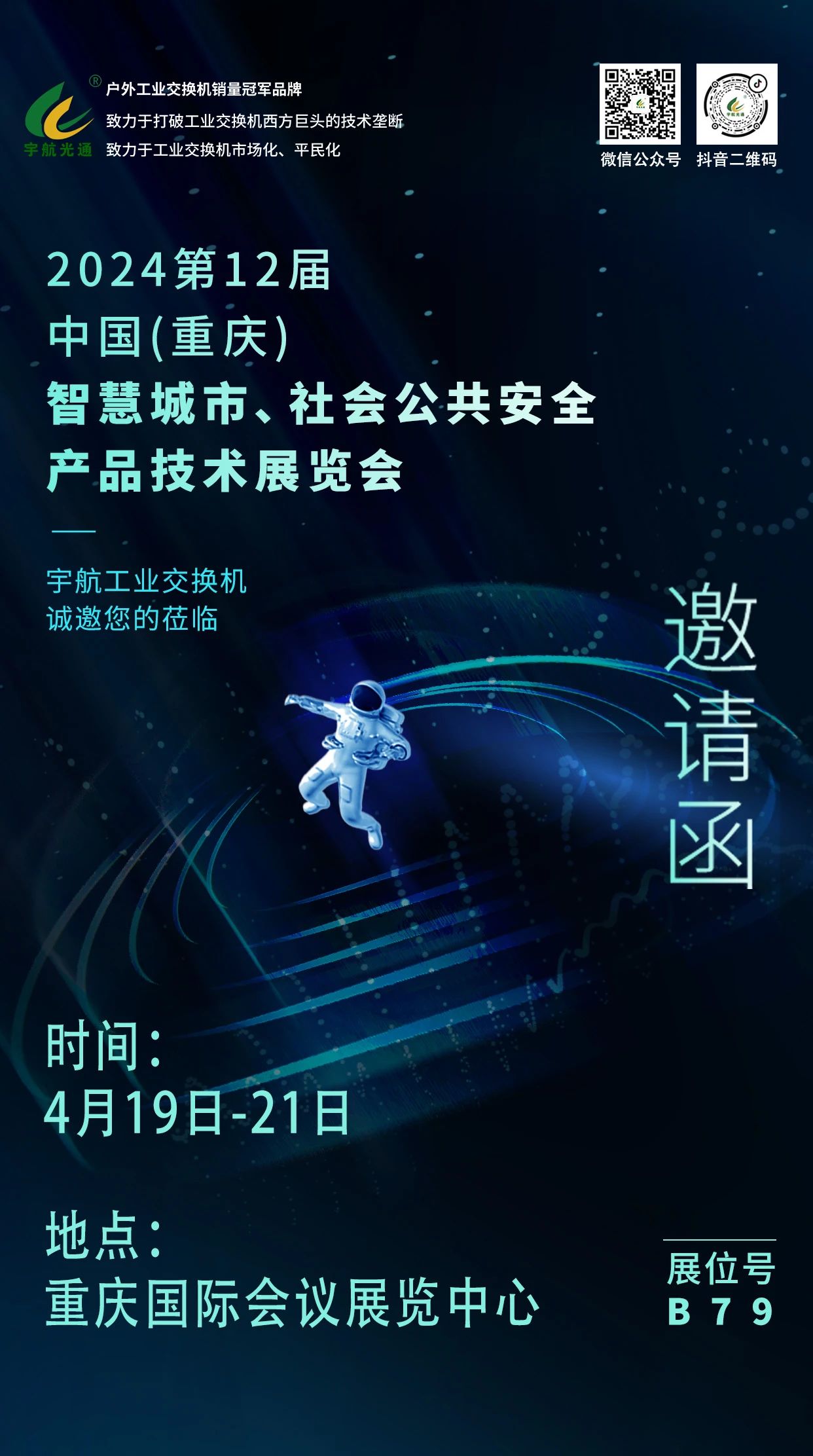 4月10-4月13日,宇航工業(yè)交換機(jī)相繼參加了2024亞洲國際交通技術(shù)與工程設(shè)施展覽會、第十四屆中國國際道路交通安全產(chǎn)品博覽會暨公安交警警用裝備展、2024重慶國際智慧電力與電氣設(shè)備展覽會以及第24屆湖南智慧安防產(chǎn)品及警用裝備博覽會,為宇航在智慧交通、智慧電力以及智慧安防等領(lǐng)域搭建了交流合作的廣闊平臺。