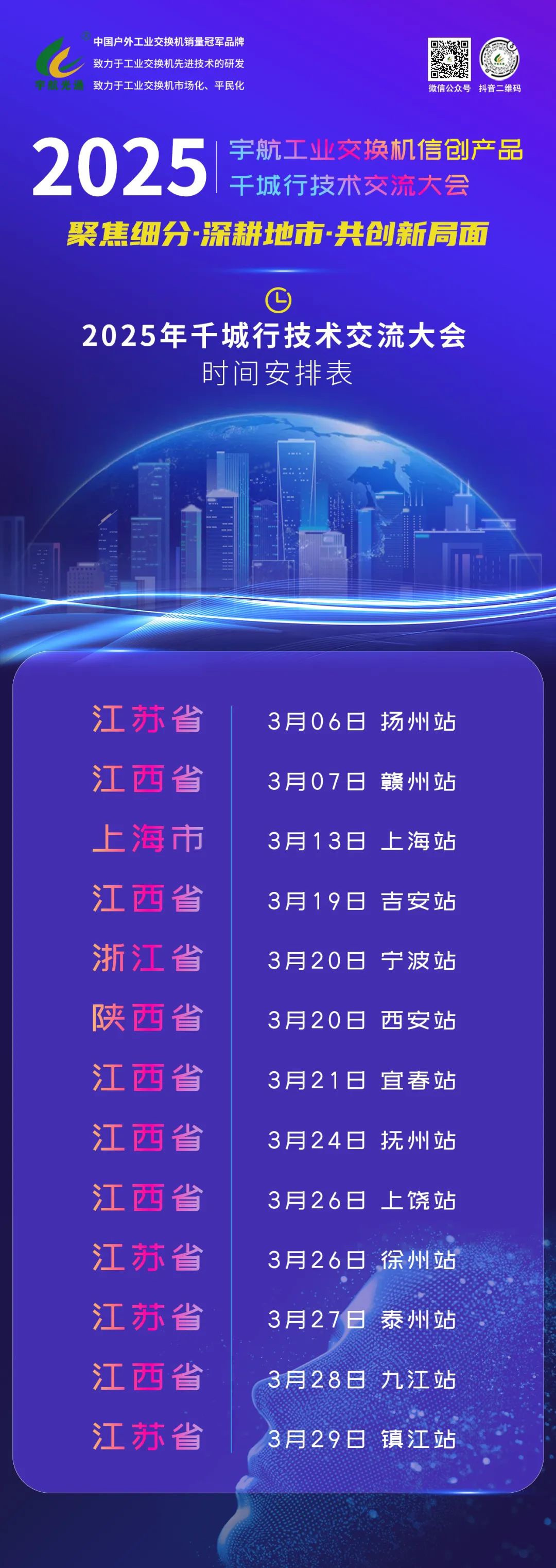 一年春作首,萬事行為先。2025宇航工業(yè)交換機(jī)信創(chuàng)產(chǎn)品干城行技術(shù)交流大會(huì)將于3月份在江蘇、江西、浙江、陜西、上海等省市盛大舉辦,具體涵蓋了13個(gè)地市。另外,3月份宇航工業(yè)交換機(jī)將亮相國際展、交通展、行業(yè)展等各大展會(huì),期待您的蒞臨。