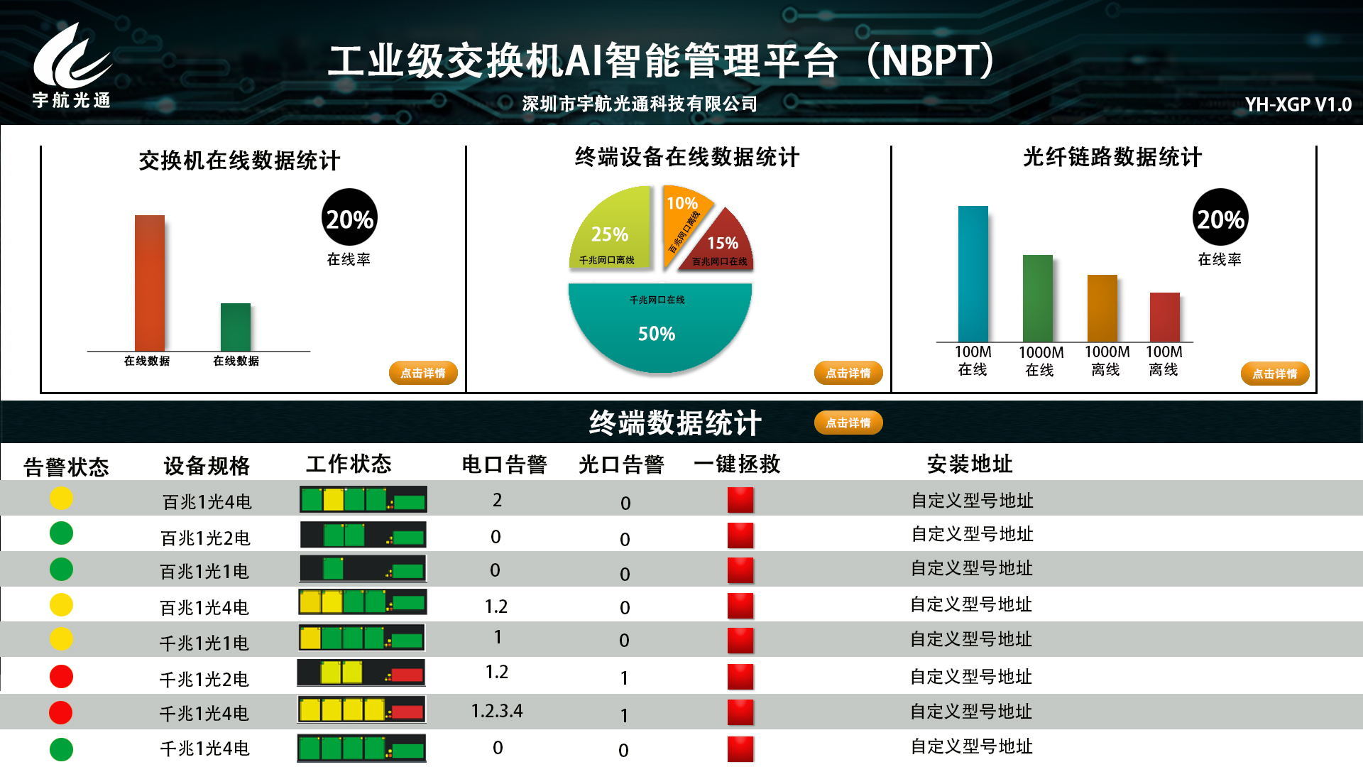 宇航專利產品:“小鋼炮”NBAI管理平臺(私有云),針對宇航自主研發的一層網管工業交換機內嵌AI智能芯片和自主研發的AI底層驅動系統,從而低成本實現傳統二層網管交換機的網管平臺功能。軟件可實現:采用狀態可視化圖形管理,讓傳輸更簡單、主管;全網設備自動識別統計、工作狀態自動分析統計,動態拓撲圖讓傳輸更透明;前后端IP設備工作狀態分析、設備自動識別統計;前端IP設備定位,全網智能掃描,故障實時預警,維護和解決故障更簡單無需長途奔波;項目集中管理,讓運維效率更高,成本更低。