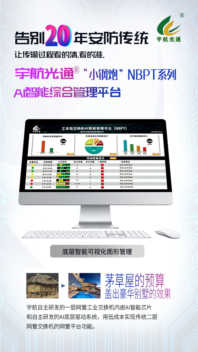 宇航專利產品:“小鋼炮”NBAI管理平臺(私有云),針對宇航自主研發的一層網管工業交換機內嵌AI智能芯片和自主研發的AI底層驅動系統,從而低成本實現傳統二層網管交換機的網管平臺功能。告別20年傳統安防傳輸方式,真正讓傳輸(過程)看的清,看的準,(傳輸數據統計)算的精。