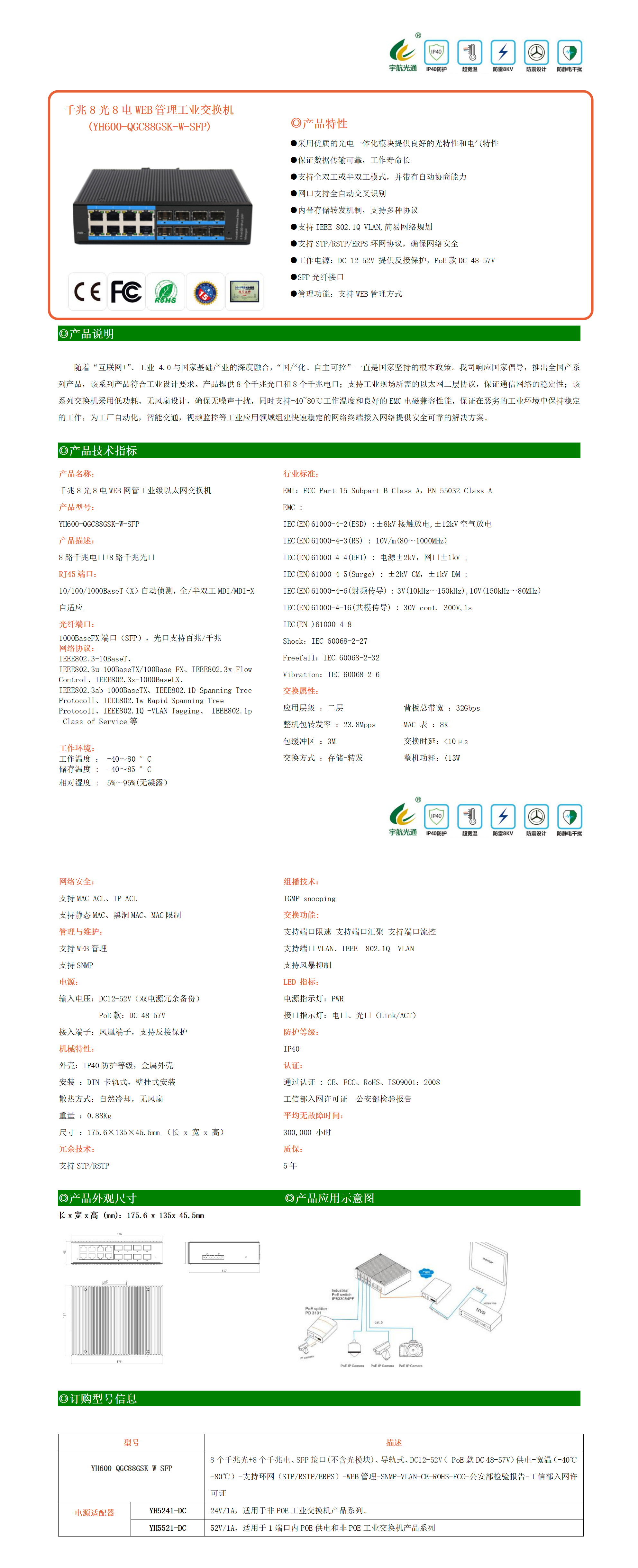 隨著“互聯網+”、工業 4.0與國家基礎產業的深度融合,“國產化、自主可控”一直是國家堅持的根本政策。我司響應國家倡導,推出全國產系列產品,該系列產品符合工業設計要求。產品提供8個千兆光口和8個千兆電口;支持工業現場所需的以太網二層協議,保證通信網絡的穩定性;該系列交換機采用低功耗、無風扇設計,確保無噪聲干擾,同時支持-40~80℃工作溫度和良好的EMC電磁兼容性能,保證在惡劣的工業環境中保持穩定的工作,為工廠自動化,智能交通,視頻監控等工業應用領域組建快速穩定的網絡終端接入網絡提供安全可靠的解決方案。