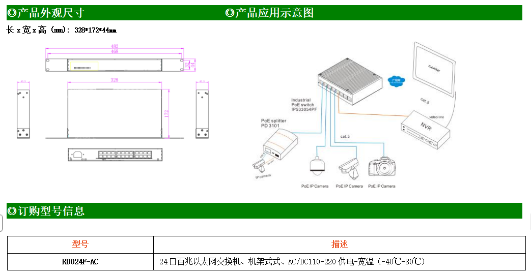 24路百兆電口工業(yè)級(jí)以太網(wǎng)交換機(jī),支持24個(gè)10Base-T/100Base-TX電口。產(chǎn)品符合FCC、CE、ROHS標(biāo)準(zhǔn)。RD024F交換機(jī)具有-40℃~80℃的工作溫度,具有超強(qiáng)的堅(jiān)固度能適應(yīng)各種嚴(yán)苛環(huán)境,也可以非常方便的安置在空間緊湊的控制箱中。機(jī)架式的安裝特性、寬溫操作及擁有IP40防護(hù)等級(jí)的外殼及LED指示燈,使RD024-AC成為一個(gè)即插即用的工業(yè)級(jí)設(shè)備,為用戶的以太網(wǎng)設(shè)備聯(lián)網(wǎng)提供可靠、便捷的解決方案。