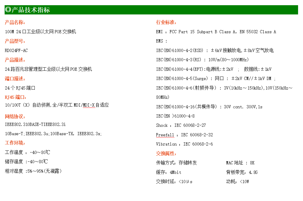 24路百兆POE電口工業(yè)級(jí)以太網(wǎng)交換機(jī),支持24個(gè)10Base-T/100Base-TX電口,所有PoE端口符合IEEE802.3af/at標(biāo)準(zhǔn)。產(chǎn)品符合FCC、CE、ROHS標(biāo)準(zhǔn)。RD024FP-AC交換機(jī)具有-40℃~80℃的工作溫度,具有超強(qiáng)的堅(jiān)固度能適應(yīng)各種嚴(yán)苛環(huán)境,也可以非常方便的安置在空間緊湊的控制箱中。機(jī)架式的安裝特性、寬溫操作及擁有IP40防護(hù)等級(jí)的外殼及LED指示燈,使RD024FP-AC成為一個(gè)即插即用的工業(yè)級(jí)設(shè)備,為用戶的以太網(wǎng)設(shè)備聯(lián)網(wǎng)提供可靠、便捷的解決方案。