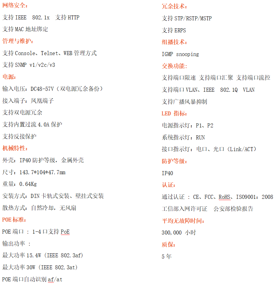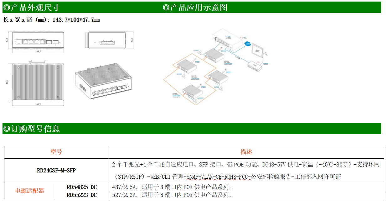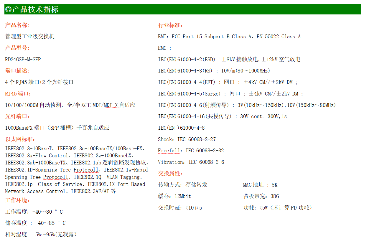 RD24GSP-M-SFP是網管型工業以太網POE交換機,產品符合FCC、CE、RoHS標準。支持2個千兆光口和4個千兆電口;支持工業現場所需的以太網二層協議,保證通信網絡的穩定性;該系列交換機采用低功耗、無風扇設計,確保無噪聲干擾,同時支持-40~80℃工作溫度和良好的EMC電磁兼容性能,保證在惡劣的工業環境中保持穩定的工作,為工廠自動化,智能交通,視頻監控等工業應用領域組建快速穩定的網絡終端接入網絡提供安全可靠的解決方案。