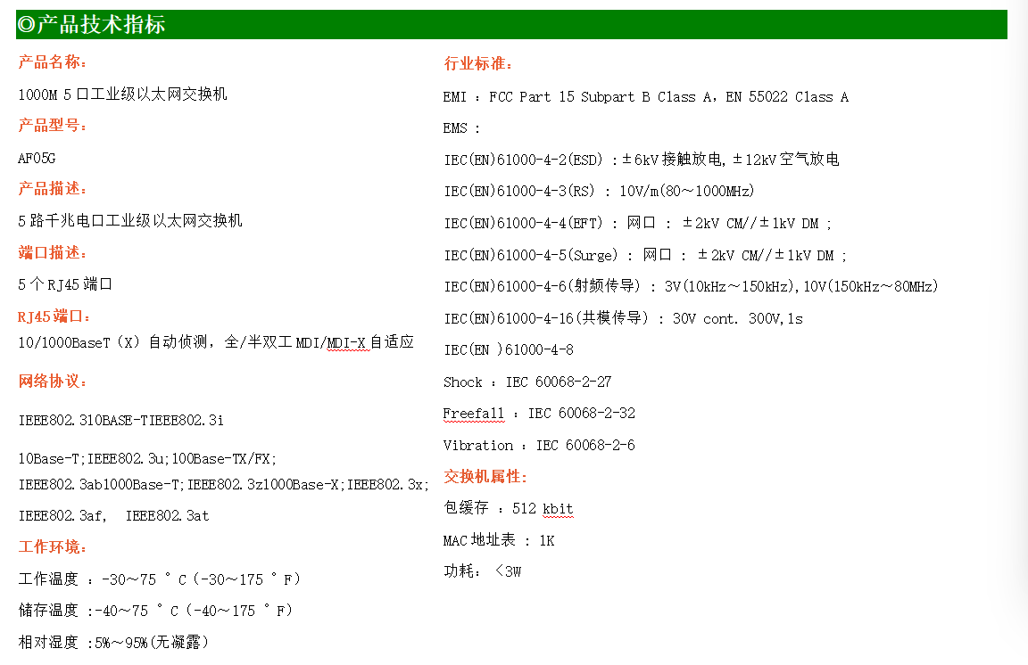 5路千兆電口工業級以太網交換機,支持5個10Base-T/100Base-TX/1000Base-TX電口。產品符合FCC、CE、ROHS標準。AF05G交換機具有-30℃~75℃的工作溫度,具有超強的堅固度能適應各種嚴苛環境,也可以非常方便的安置在空間緊湊的控制箱中。導軌的安裝特性、寬溫操作及擁有IP40防護等級的外殼及LED指示燈,使AF05G成為一個即插即用的工業級設備,為用戶的以太網設備聯網提供可靠、便捷的解決方案。