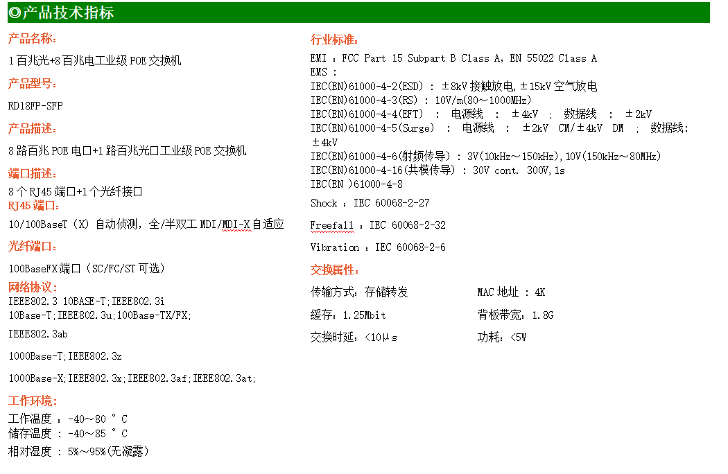 4路百兆電口+2路百兆FX光口工業級以太網交換機,支持4個10Base-T/100Base-TX電口和2個100Base-X光口。產品符合FCC、CE、ROHS標準。AF24F系列交換機具有-30℃~75℃的工作溫度,具有超強的堅固度能適應各種嚴苛環境,也可以非常方便的安置在空間緊湊的控制箱中。導軌的安裝特性、寬溫操作及擁有IP40防護等級的外殼及LED指示燈,使AF24F成為一個即插即用的工業級設備,為用戶的以太網設備聯網提供可靠、便捷的解決方案。