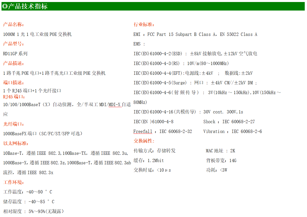 1路千兆POE電口+1路千兆FX光口工業(yè)級以太網(wǎng)POE交換機,支持1個10/100Base-TX電口和1個100Base-X光口。產(chǎn)品符合FCC、CE、ROHS標(biāo)準(zhǔn)。RD11GP系列交換機具有-40℃~80℃的工作溫度,具有超強的堅固度能適應(yīng)各種嚴(yán)苛環(huán)境,也可以非常方便的安置在空間緊湊的控制箱中。導(dǎo)軌的安裝特性、寬溫操作及擁有IP40防護等級的外殼及LED指示燈,使RD11GP成為一個即插即用的工業(yè)級設(shè)備,為用戶的以太網(wǎng)設(shè)備聯(lián)網(wǎng)提供可靠、便捷的解決方案。