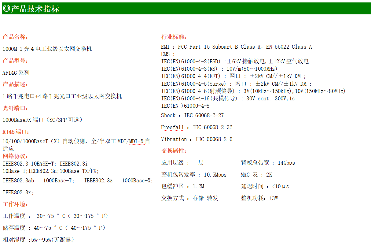 4路千兆電口+1路千兆FX光口工業級以太網交換機,支持4個100Base-T/1000Base-TX電口和1個1000Base-X光口。產品符合FCC、CE、ROHS標準。AF14G系列交換機具有-30℃~75℃的工作溫度,具有超強的堅固度能適應各種嚴苛環境,也可以非常方便的安置在空間緊湊的控制箱中。導軌的安裝特性、寬溫操作及擁有IP40防護等級的外殼及LED指示燈,使AF14G成為一個即插即用的工業級設備,為用戶的以太網設備聯網提供可靠、便捷的解決方案。