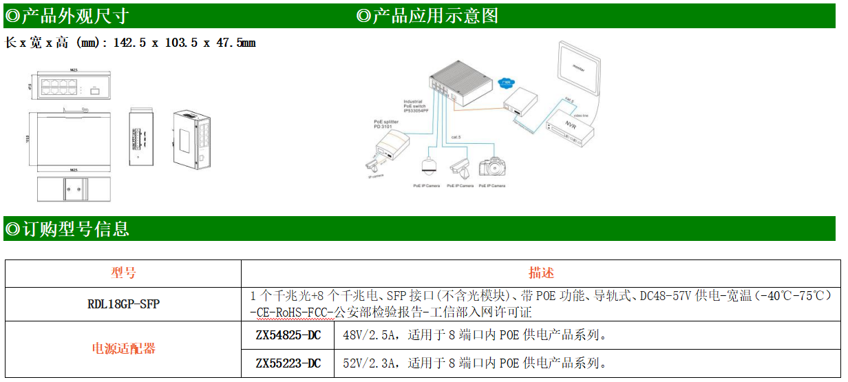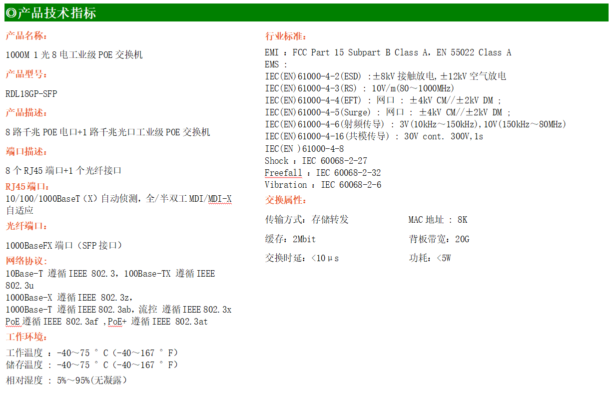 8路千兆POE電口+1路千兆FX光口工業級以太網POE交換機,支持8個10/100/1000Base-TX電口和1個1000Base-X光口。產品符合FCC、CE、ROHS標準。RDL18GP交換機具有-40℃~75℃的工作溫度,具有超強的堅固度能適應各種嚴苛環境,也可以非常方便的安置在空間緊湊的控制箱中。導軌的安裝特性、寬溫操作及擁有IP40防護等級的外殼及LED指示燈,使RDL18GP成為一個即插即用的工業級設備,為用戶的以太網設備聯網提供可靠、便捷的解決方案。