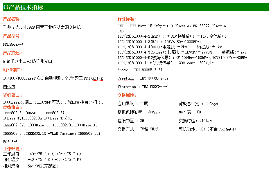 RDL28GS-W-SFP系列WEB網(wǎng)管工業(yè)級(jí)以太網(wǎng)交換機(jī),產(chǎn)品符合FCC、CE、ROHS標(biāo)準(zhǔn),支持工業(yè)現(xiàn)場(chǎng)所需的以太網(wǎng)二層協(xié)議,保證通信網(wǎng)絡(luò)的穩(wěn)定性。該系列交換機(jī)采用低功耗、無風(fēng)扇設(shè)計(jì),確保無噪聲干擾,同時(shí)支持-40~75℃工作溫度和良好的EMC電磁兼容性能,保證在惡劣的工業(yè)環(huán)境中保持穩(wěn)定的工作,為工廠自動(dòng)化,智能交通,視頻監(jiān)控等工業(yè)應(yīng)用領(lǐng)域組建快速穩(wěn)定的網(wǎng)絡(luò)終端接入網(wǎng)絡(luò)提供安全可靠的解決方案。