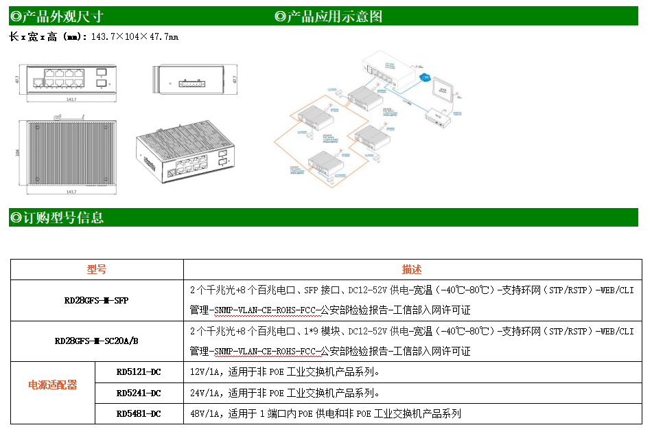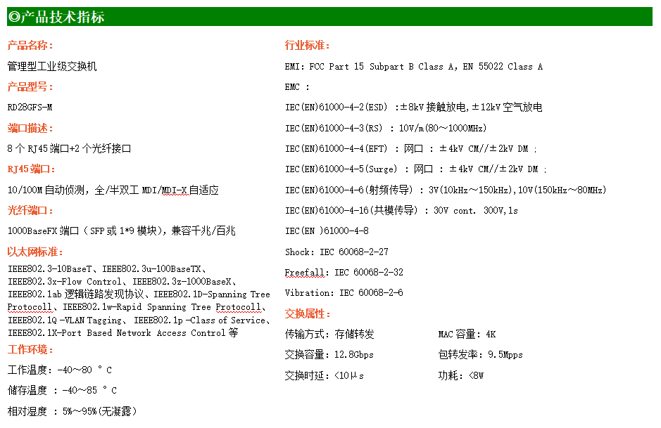 RD28GFS-M-SFP是網管型工業(yè)以太網交換機,產品符合FCC、CE、RoHS標準。支持2個千兆光口和8個百兆電口;支持工業(yè)現場所需的以太網二層協(xié)議,保證通信網絡的穩(wěn)定性;該系列交換機采用低功耗、無風扇設計,確保無噪聲干擾,同時支持-40~80℃工作溫度和良好的EMC電磁兼容性能,保證在惡劣的工業(yè)環(huán)境中保持穩(wěn)定的工作,為工廠自動化,智能交通,視頻監(jiān)控等工業(yè)應用領域組建快速穩(wěn)定的網絡終端接入網絡提供安全可靠的解決方案。