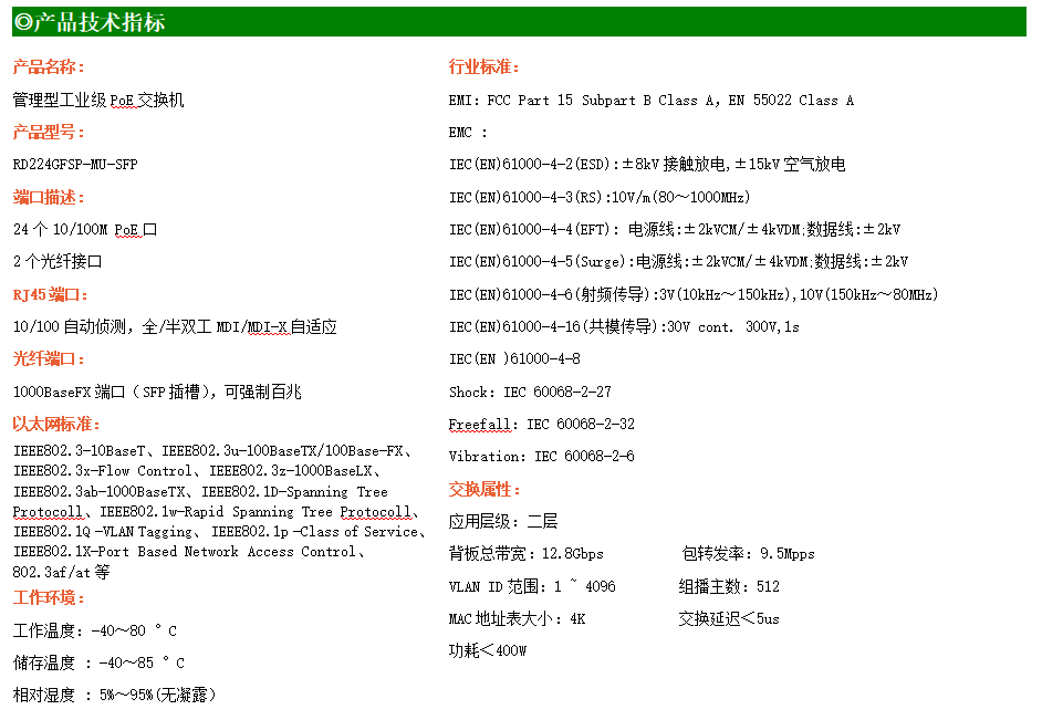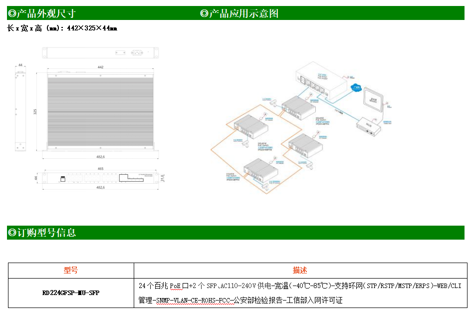 RD224GFSP-MU-SFP是網(wǎng)管型工業(yè)以太網(wǎng)PoE交換機(jī),產(chǎn)品符合FCC、CE、RoHS標(biāo)準(zhǔn)。可提供24個(gè)百兆PoE端口,所有PoE端口符合IEEE802.3af/at標(biāo)準(zhǔn)。支持工業(yè)現(xiàn)場(chǎng)所需的以太網(wǎng)二層協(xié)議,保證通信網(wǎng)絡(luò)的穩(wěn)定性;該系列交換機(jī)采用低功耗、無風(fēng)扇設(shè)計(jì),確保無噪聲干擾,同時(shí)支持-40~85℃工作溫度和良好的EMC電磁兼容性能,保證在惡劣的工業(yè)環(huán)境中保持穩(wěn)定的工作,為工廠自動(dòng)化,智能交通,視頻監(jiān)控等工業(yè)應(yīng)用領(lǐng)域組建快速穩(wěn)定的網(wǎng)絡(luò)終端接入網(wǎng)絡(luò)提供安全可靠的解決方案。