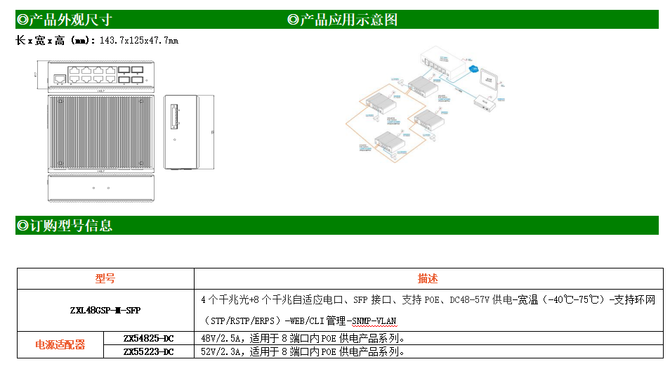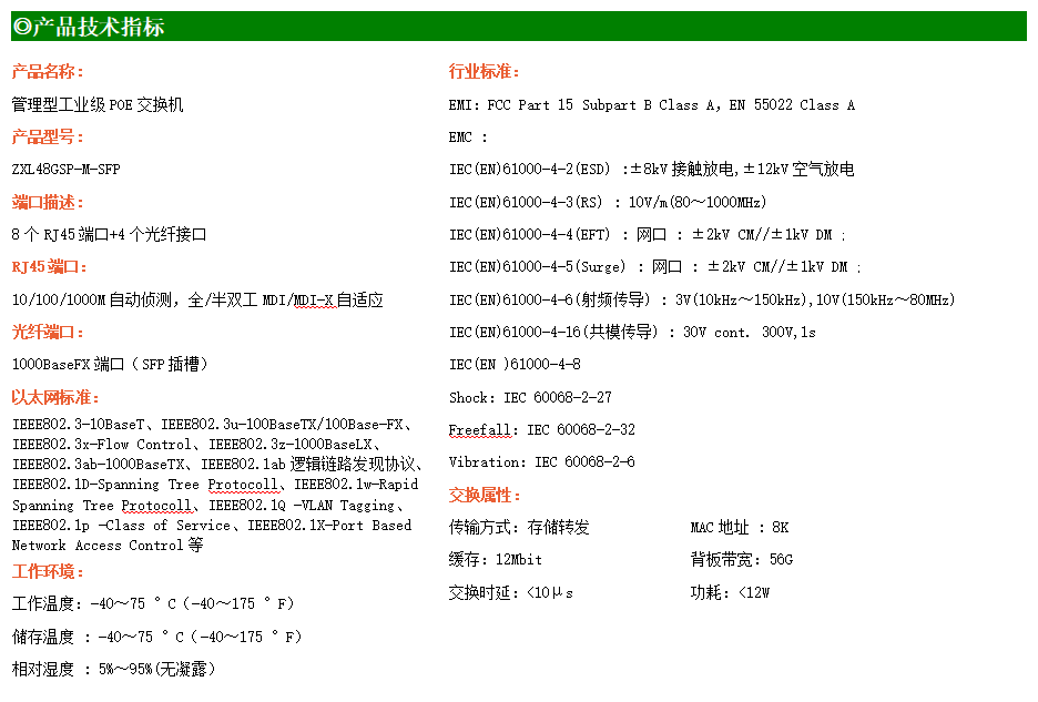 ZXL48GSP-M-SFP是網(wǎng)管型工業(yè)以太網(wǎng)POE交換機(jī),產(chǎn)品符合FCC、CE、RoHS標(biāo)準(zhǔn)。支持4個(gè)千兆光口和8個(gè)千兆電口;支持工業(yè)現(xiàn)場所需的以太網(wǎng)二層協(xié)議,保證通信網(wǎng)絡(luò)的穩(wěn)定性;該系列交換機(jī)采用低功耗、無風(fēng)扇設(shè)計(jì),確保無噪聲干擾,同時(shí)支持-40~75℃工作溫度和良好的EMC電磁兼容性能,保證在惡劣的工業(yè)環(huán)境中保持穩(wěn)定的工作,為工廠自動(dòng)化,智能交通,視頻監(jiān)控等工業(yè)應(yīng)用領(lǐng)域組建快速穩(wěn)定的網(wǎng)絡(luò)終端接入網(wǎng)絡(luò)提供安全可靠的解決方案。
