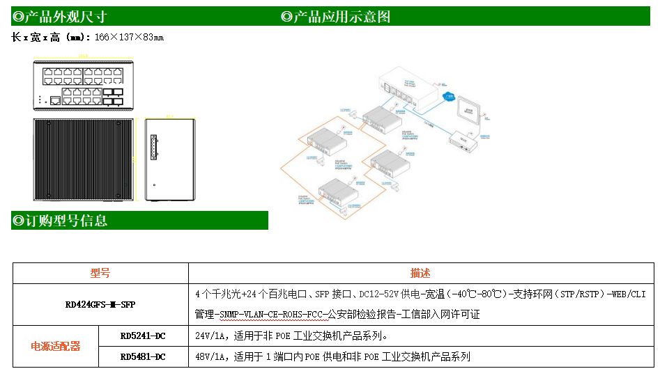 RD424GFS-M是網管型工業以太網交換機,產品符合FCC、CE、RoHS標準。支持2個千兆光口和24個百兆電口;支持工業現場所需的以太網二層協議,保證通信網絡的穩定性;該系列交換機采用低功耗、無風扇設計,確保無噪聲干擾,同時支持-40~80℃工作溫度和良好的EMC電磁兼容性能,保證在惡劣的工業環境中保持穩定的工作,為工廠自動化,智能交通,視頻監控等工業應用領域組建快速穩定的網絡終端接入網絡提供安全可靠的解決方案。