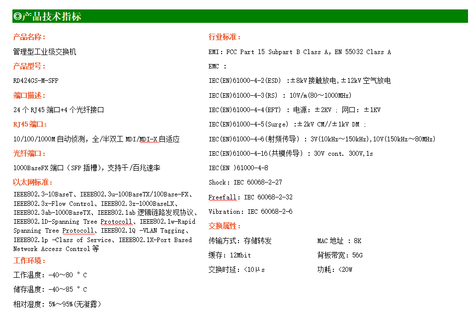 RD424GS-M-SFP是網管型工業以太網交換機,產品符合FCC、CE、RoHS標準。支持4個千兆光口和24個千兆電口;支持工業現場所需的以太網二層協議,保證通信網絡的穩定性;該系列交換機采用低功耗、無風扇設計,確保無噪聲干擾,同時支持-40~80℃工作溫度和良好的EMC電磁兼容性能,保證在惡劣的工業環境中保持穩定的工作,為工廠自動化,智能交通,視頻監控等工業應用領域組建快速穩定的網絡終端接入網絡提供安全可靠的解決方案。