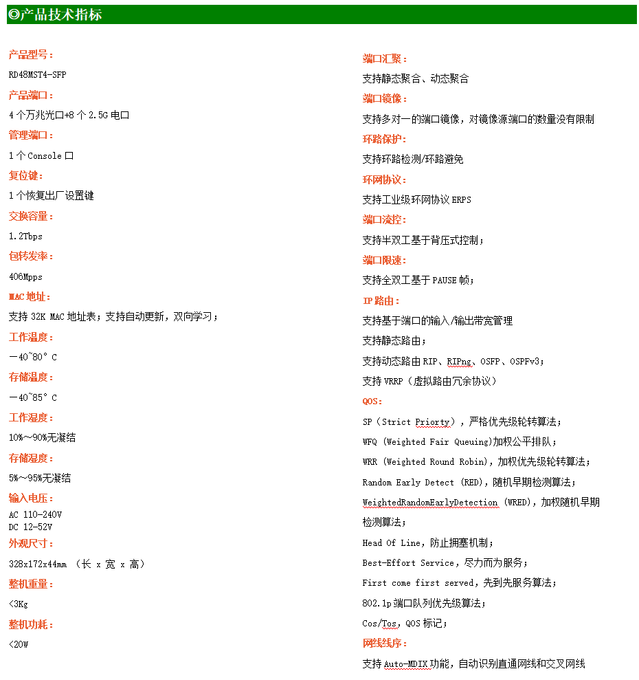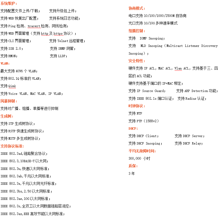 ●網(wǎng)絡(luò)冗余:支持STP/RSTP/MSTP,支持ERPS(自愈時(shí)間<20ms)
