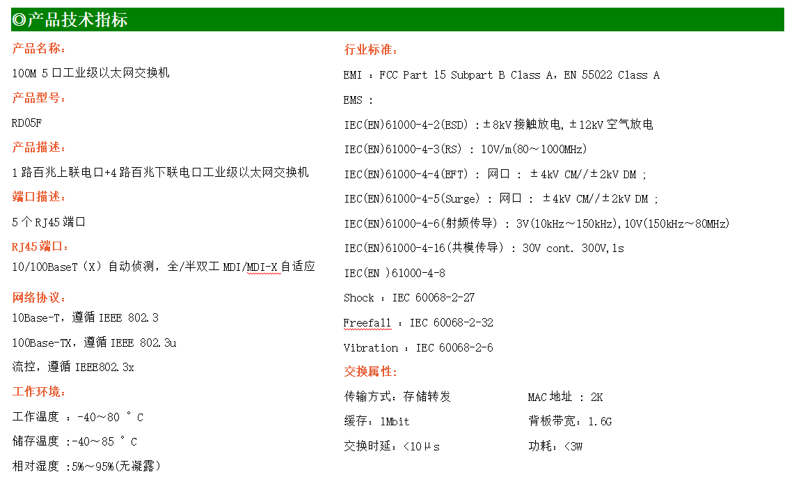 1路百兆上聯(lián)電口+4路百兆下聯(lián)電口工業(yè)級(jí)以太網(wǎng)交換機(jī),支持1個(gè)10/100Base-TX上聯(lián)電口和4個(gè)10Base-T/100Base-TX下聯(lián)電口。產(chǎn)品符合FCC、CE、ROHS標(biāo)準(zhǔn)。RD05F交換機(jī)具有-40℃~80℃的工作溫度,具有超強(qiáng)的堅(jiān)固度能適應(yīng)各種嚴(yán)苛環(huán)境,也可以非常方便的安置在空間緊湊的控制箱中。導(dǎo)軌的安裝特性、寬溫操作及擁有IP40防護(hù)等級(jí)的外殼及LED指示燈,使RD05F成為一個(gè)即插即用的工業(yè)級(jí)設(shè)備,為用戶的以太網(wǎng)設(shè)備聯(lián)網(wǎng)提供可靠、便捷的解決方案。