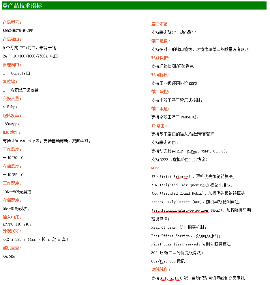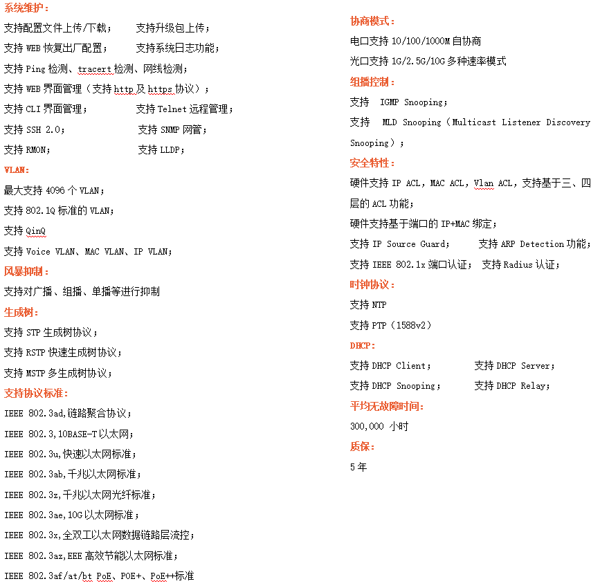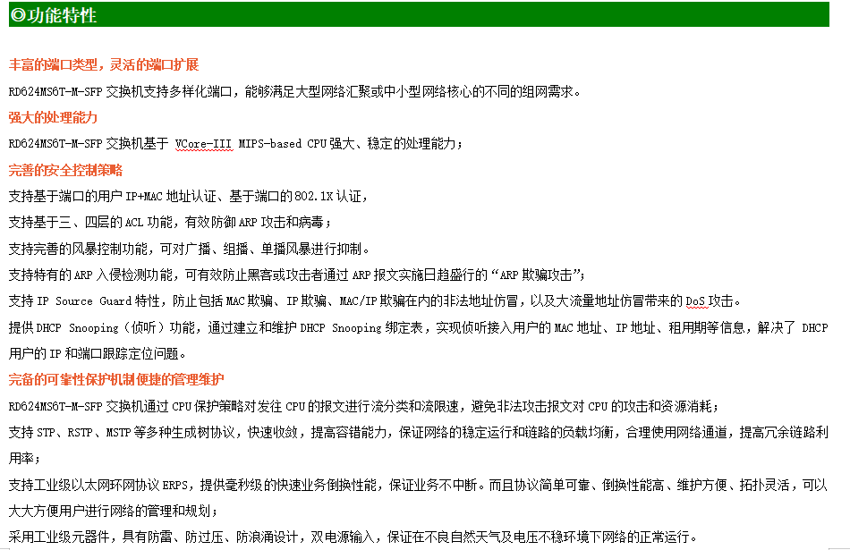 ●網(wǎng)絡(luò)冗余:支持STP/RSTP/MSTP,支持ERPS(自愈時(shí)間<20ms)